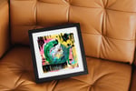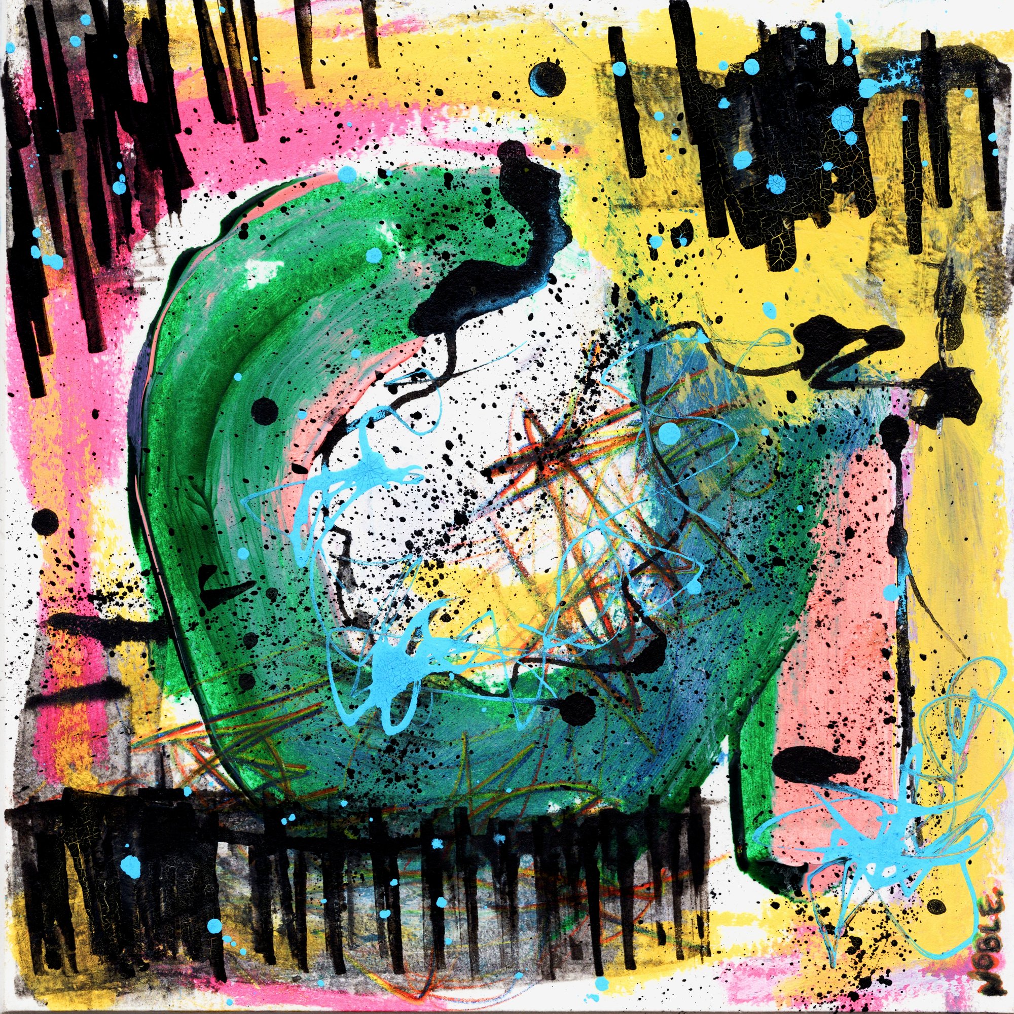 An energetic and expressive painting done in two parts - first the green partial circle was made, then the multi-colored pencil was used for mark making & to add free movement & dramatic gesture. Next the pink & yellow neon contrast was added. And finally, the free flowing black lines, dapples, & finishing turquoise spackles & scratches were added to finalize the piece. An electric and energizing piece of artwork that would look beautiful in a large matted frame or close cropped small frame.